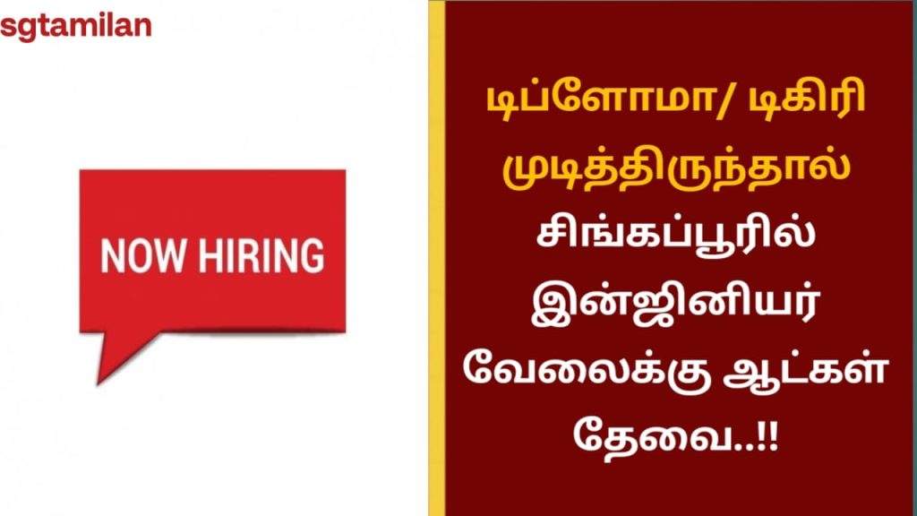 டிப்ளோமா/ டிகிரி முடித்திருந்தால் சிங்கப்பூரில் இன்ஜினியர் வேலைக்கு ஆட்கள் தேவை..!! இந்த வேலை வாய்ப்பு பற்றி முழுவதுமாக படித்துவிட்டு விண்ணப்பிக்கவும்.எங்கள் அலுவலகம் இந்திய நேரப்படி காலை 9.30 மணி முதல் மாலை 06.00 மணி வரை மட்டுமே திறந்திருக்கும்.அந்த நேரங்களில் மட்டுமே பதில் கிடைக்கும். ஞாயிற்றுக்கிழமை விடுமுறை.மேலும் இப்பதிவில் கொடுக்கப்பட்டுள்ள டெலெக்ராம் id க்கு மட்டும் தொடர்பு கொள்ளவும்.குறிப்பு : இந்த வேலைக்கான தகுதி இருந்தால் மட்டும் விண்ணப்பிக்கவும்.நாங்கள் தினந்தோறும் நிறைய வேலை வாய்ப்புகளைப் பதிவிடுகிறோம். இதனால்,...
