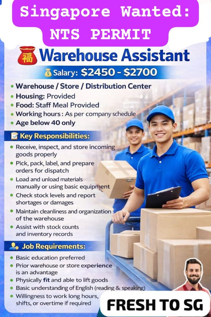 சிங்கப்பூரில் NTS PERMIT இல் அசிஸ்டன்ட் வேலையில் பணிபுரிய ஆட்கள் தேவை..!!