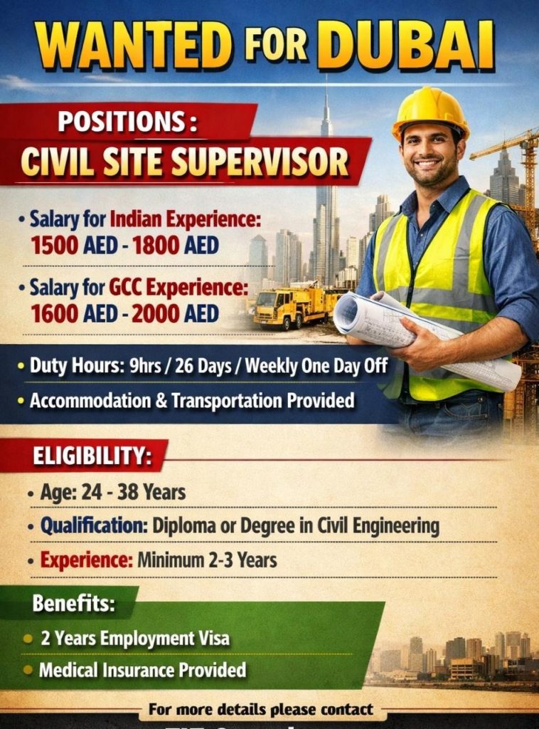 சிவில் படித்தவர்களுக்கு வெளிநாட்டில் சூப்பர்வைசர் வேலை வாய்ப்பு..!! இந்தியாவில் வேலை பார்த்த அனுபவம் இருந்தால் போதும்..!!