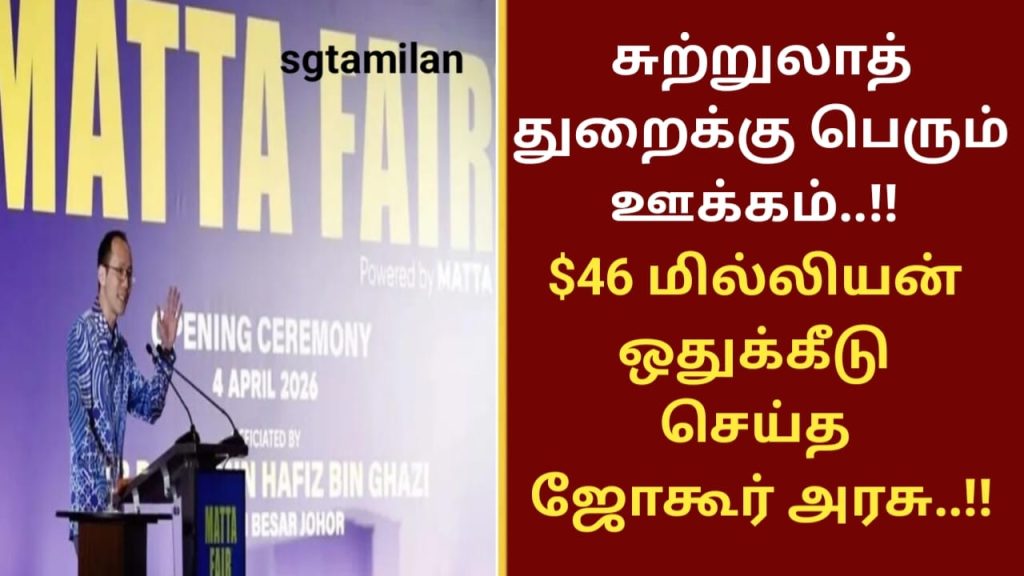 சுற்றுலாத் துறைக்கு பெரும் ஊக்கம்..!! $46 மில்லியன் ஒதுக்கீடு செய்த ஜோகூர் அரசு..!! ஜோகூர் : சுற்றுலாத்துறையின் மேம்பாட்டை ஊக்குவிக்கும் விதமாக மலேசியாவின் ஜோகூர் மாநில அரசானது சுற்றுலாத்துறைக்கு 2025 ஆம் ஆண்டிலிருந்து,143.84 மில்லியன் ரிங்கிட்டிற்கும் (S$ 45.9)அதிகமான தொகையை ஒதுக்கீடு செய்துள்ளது. மலேசிய அனைத்துலக வணிக மற்றும் கண்காட்சி நிலையத்தில் “மலேசிய சுற்றுலா, பயண முகவர் சங்கக் கண்காட்சி2026” (மாட்டா 2006) நடைபெற்று வருகிறது. CLICK HERE 👉👉சிங்கப்பூரில் இன்டீரியர் டிசைனராக பணிபுரிய ஆட்கள் தேவை..!!